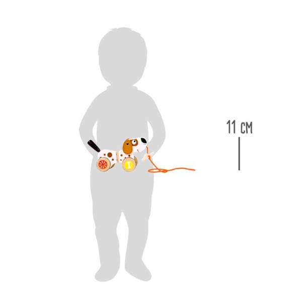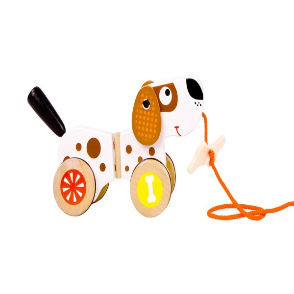 Woef woef! Kleine kinderen kunnen dit hondje achter zich aan trekken. Zijn wielen hebben rubberen ringen om het geluid te verminderen. Hij kwispelt met zijn oren en staart en slaat in elke bocht een goed figuur. Een bot aan een touwtje dient als beloning. Kleine kinderen kunnen dit hondje achter zich aan trekken.