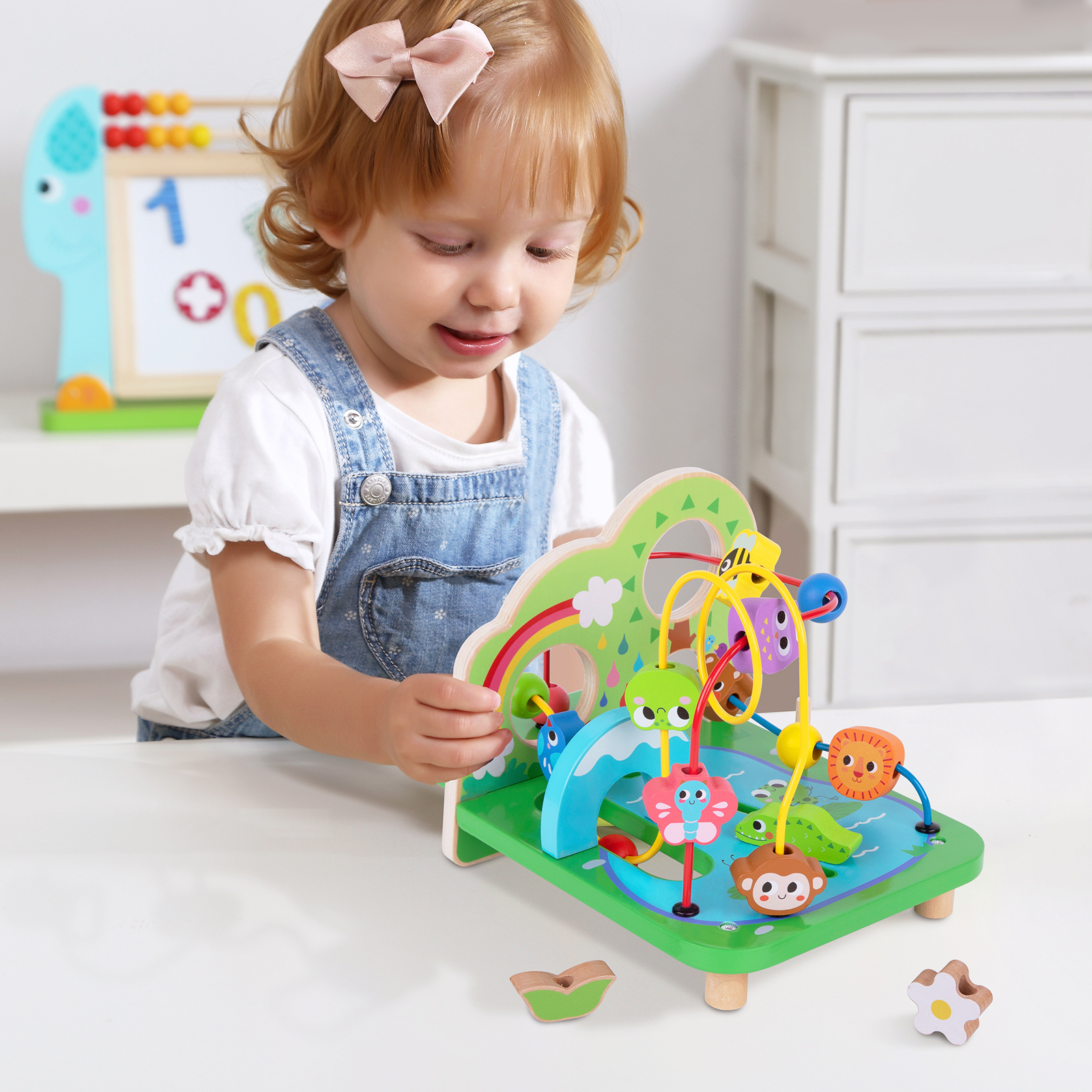 Deze vrolijke, gekleurde houten kralenspiraal laat kinderen op een leuke manier hun concentratie en motoriek ontwikkelen. Hij is voorzien van 3 draden met kralen en diertjes zoals een aap, uil, leeuw en een beer om van, naar en door de berg te schuiven. Het bord bevat tevens 2 wortelen om erin te steken en een kleine stapeltomaat om vaardigheid en behendigheid te ontwikkelen. Gegarandeerd urenlang speelplezier.